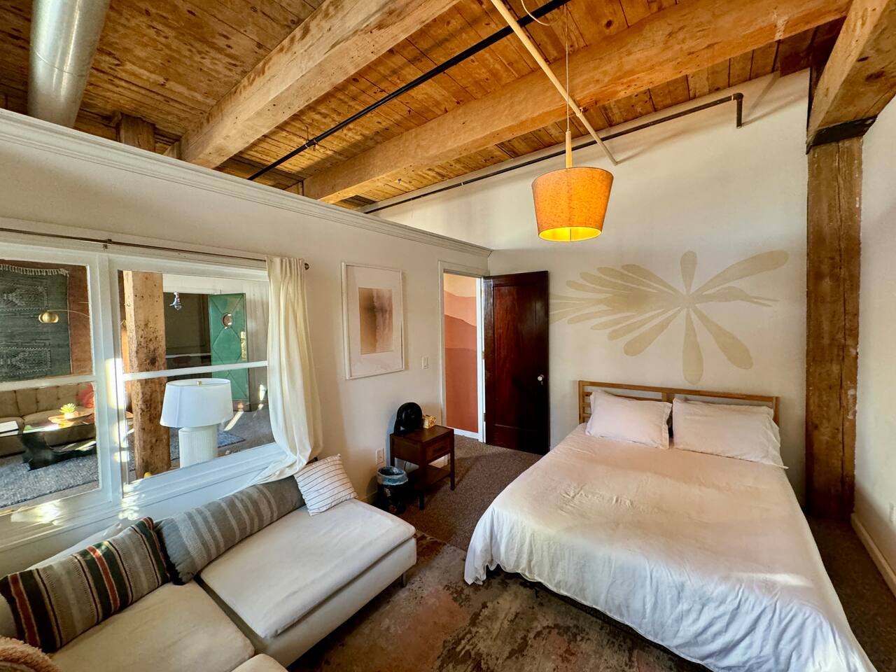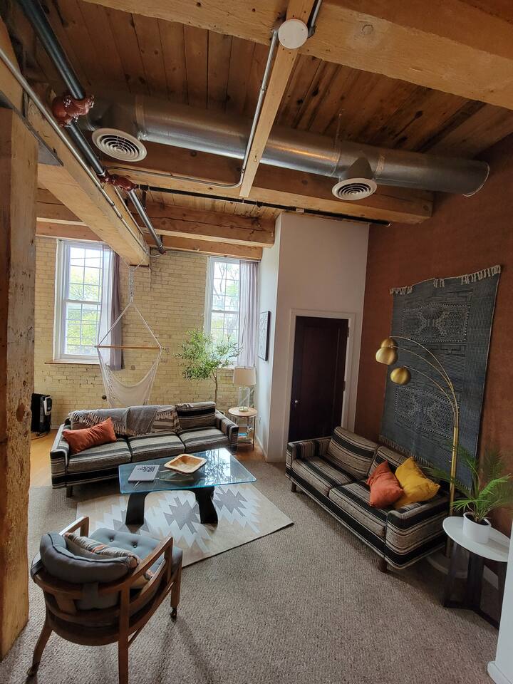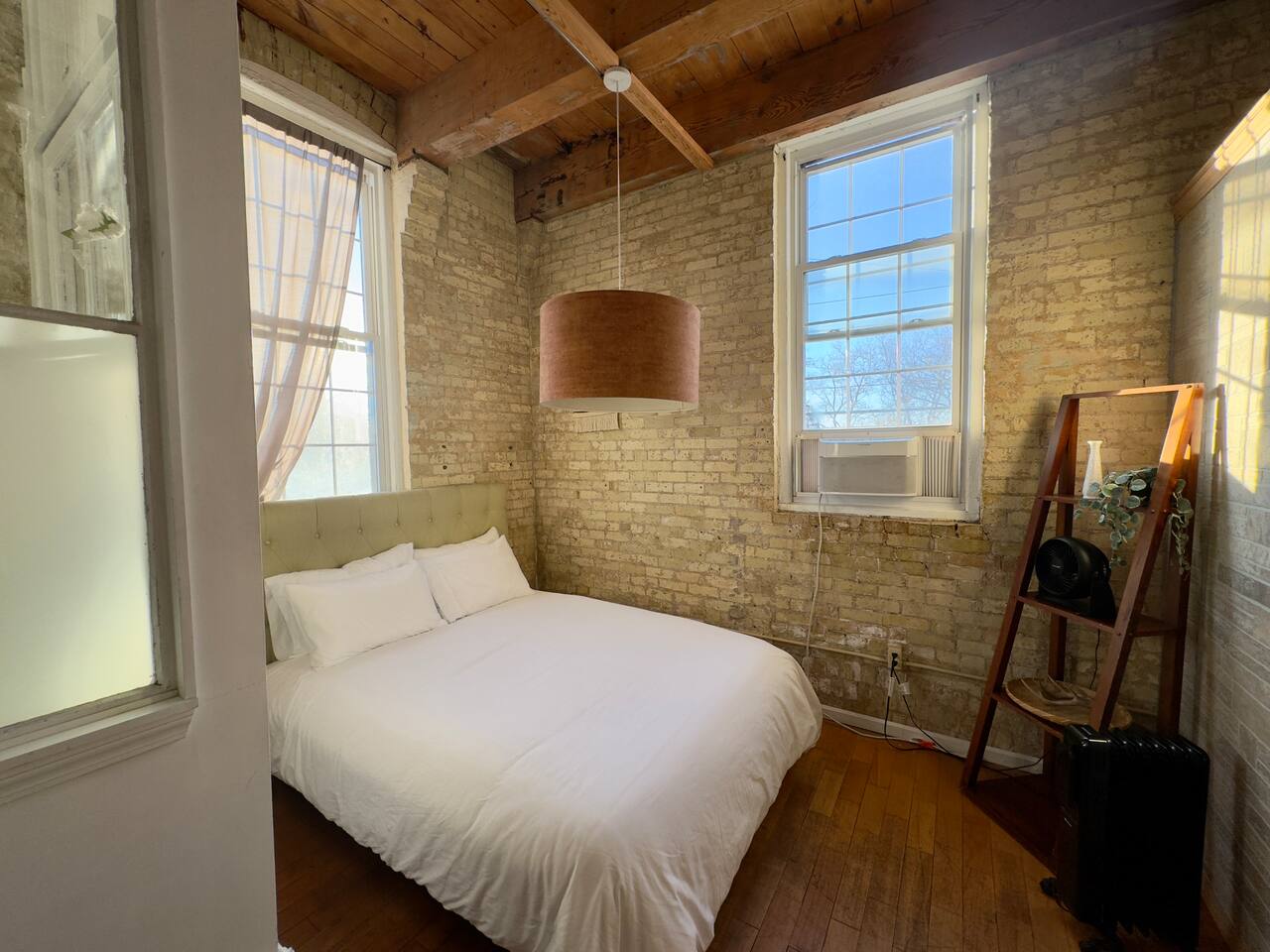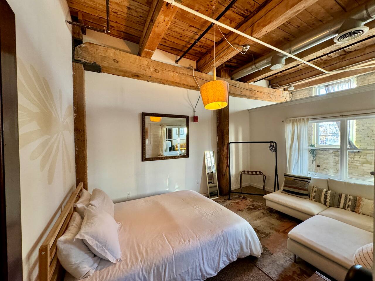 This unique timber loft (newly redecorated by our new operational team - Oct 2021) is located on the water where the Milwaukee and Kinnickinnic rivers join the Milwaukee harbor on the Great Lake Michigan. This large two bedroom space sleeps 6 guests on varied bed, day bed and comfy pull out couches. The suite is located on the second story of Milwaukee's premiere cocktail bar, Boone & Crockett. The site also houses The Cooperage, the city's newest concert and private event venue, and the locally beloved Taco Moto taco truck. Take to the water by one of the three boating options. Electric Duffy boats (seats up to 12) can be rented from Milwaukee Paddle Tavern on site. Paddle Tavern Tours are booked on the grounds and Brew City Kayak rent and launch kayaks. Milwaukee Pedal Tavern tours are also booked and dispatched streetside.