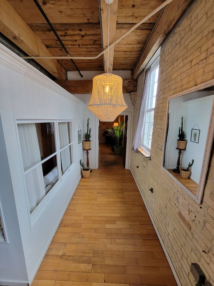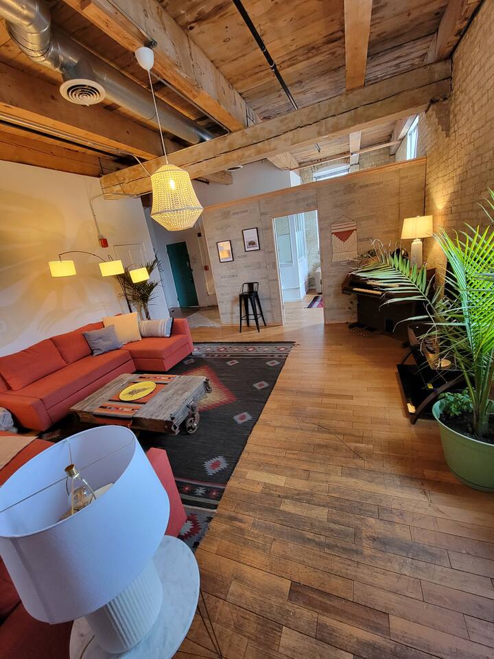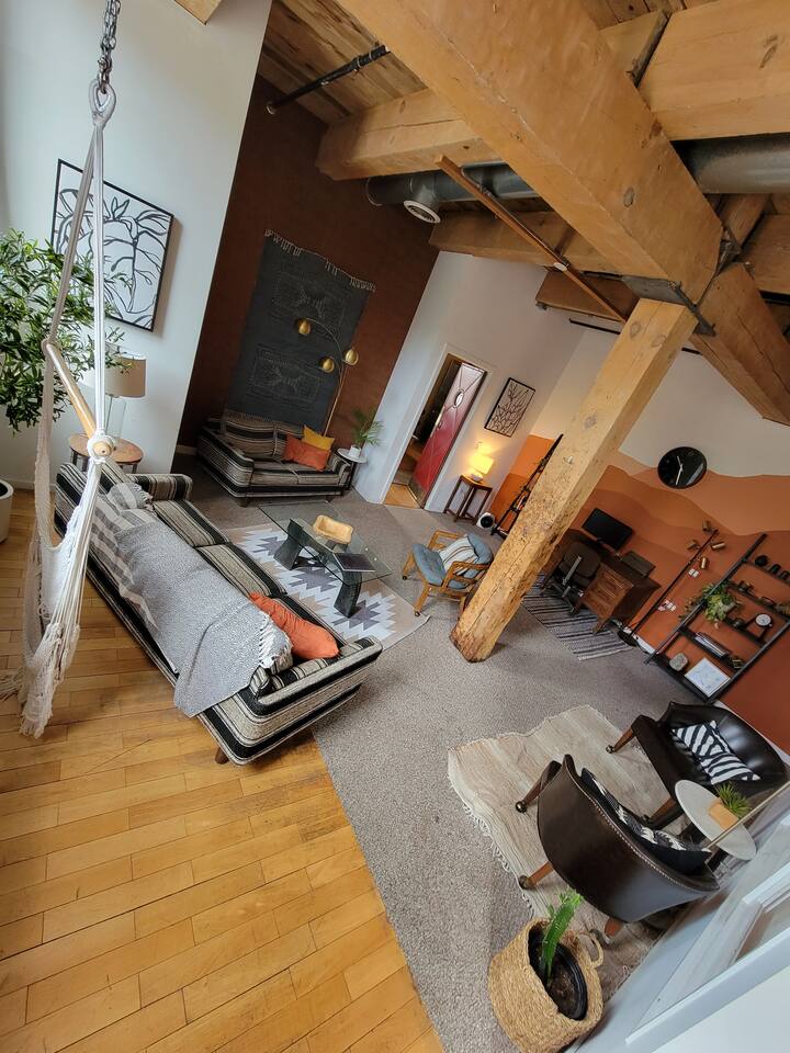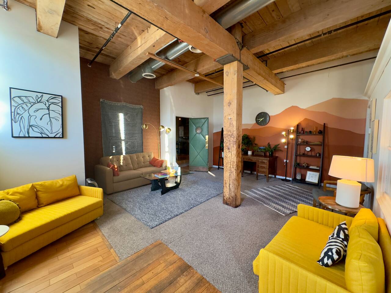 This unique timber loft (newly redecorated by our new operational team - Oct 2021) is located on the water where the Milwaukee and Kinnickinnic rivers join the Milwaukee harbor on the Great Lake Michigan. This large two bedroom space sleeps 6 guests on varied bed, day bed and comfy pull out couches. The suite is located on the second story of Milwaukee's premiere cocktail bar, Boone & Crockett. The site also houses The Cooperage, the city's newest concert and private event venue, and the locally beloved Taco Moto taco truck. Take to the water by one of the three boating options. Electric Duffy boats (seats up to 12) can be rented from Milwaukee Paddle Tavern on site. Paddle Tavern Tours are booked on the grounds and Brew City Kayak rent and launch kayaks. Milwaukee Pedal Tavern tours are also booked and dispatched streetside.